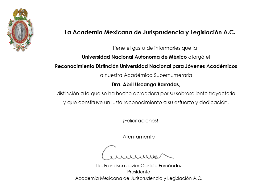 Reconocimiento Distinción Universidad Nacional para Jóvenes Académicos a nuestra Académica Supernumeraria Dra. Abril Uscanga Barradas